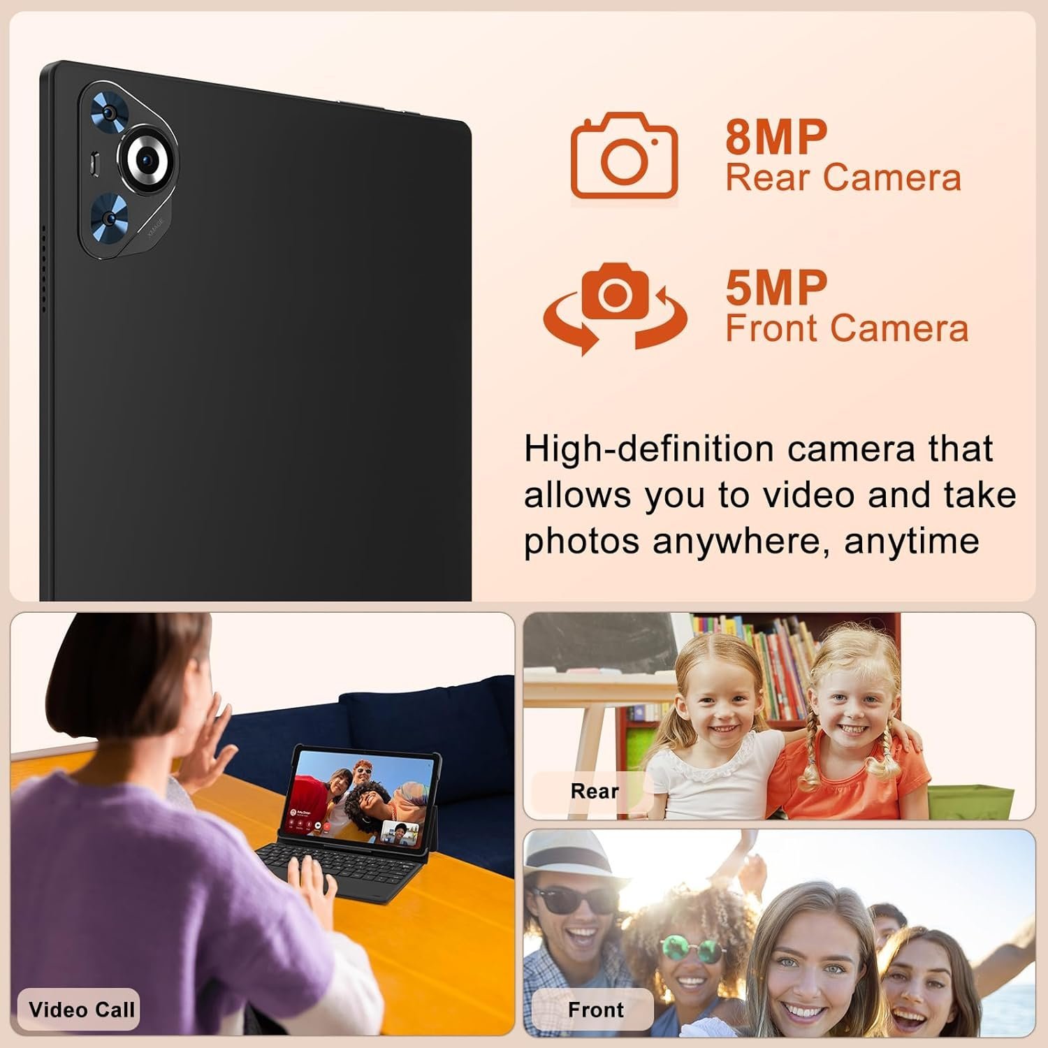 Diseño elegante: Presenta un elegante cuerpo metálico con perfil de bordes rectos y cámaras estelares (5 MP + 8 MP). La pantalla LCD de 1280×800 filtra la luz azul dañina para reducir la fatiga ocular y mantener la nitidez visual.